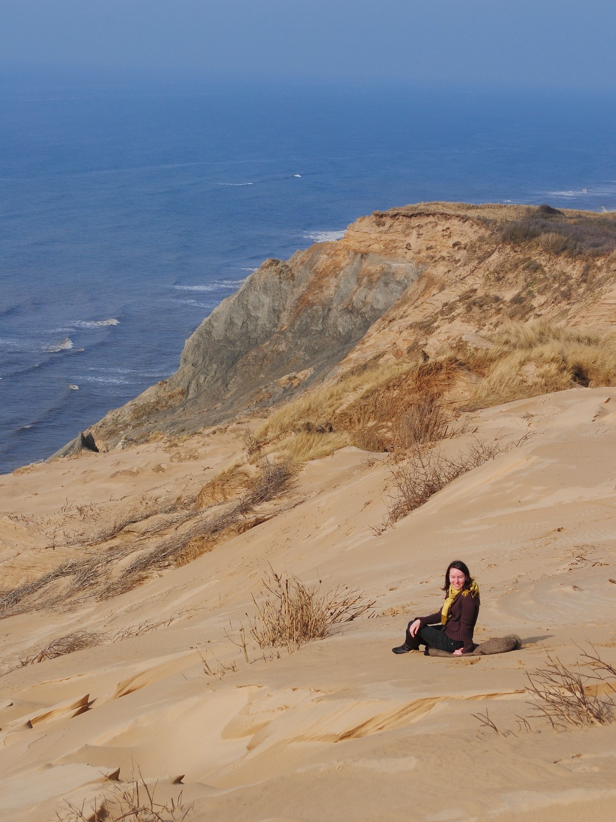 Další bod programu byl ještě působivější. Maják z roku 1900 stojí na vrchu útesu, cca 60m nad hladinou moře, původně stála cca 200m od pobřeží. V průběhu času se ale písek přesouval, moře přibližovalo a před 23m vysokým majákem se tvořily duny, které byly tak velké, že v roce 1968 přestal být maják z moře vidět. Sloužil dále jako muzeum, které ale muselo být v roce 2002 uzavřeno, protože písek už býl všude okolo a ničil budovy. Dneska by mě ani nenapadlo, že maják někdy mohl stát jinde, než uprostřed písečné duny…