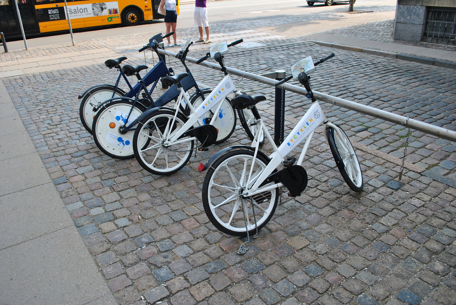 Kodaň byla podle všeho první město, kde zavedli městská turistická kola. Jako u košíků v supermarketu vložíte minci, tady tedy dvacku, a jedete kam chcete. Na řidítkách máte mapu s památkami, občas doporučené cesty a samozřejmě všechna místa, kde můžete kolo vrátit. V roce 2003 zde prý bylo 2500 těchto kol. Po příjezdu do centra jsme tedy jako první zamířili k prvnímu stojanu a snažili se nějaké kolo získat.